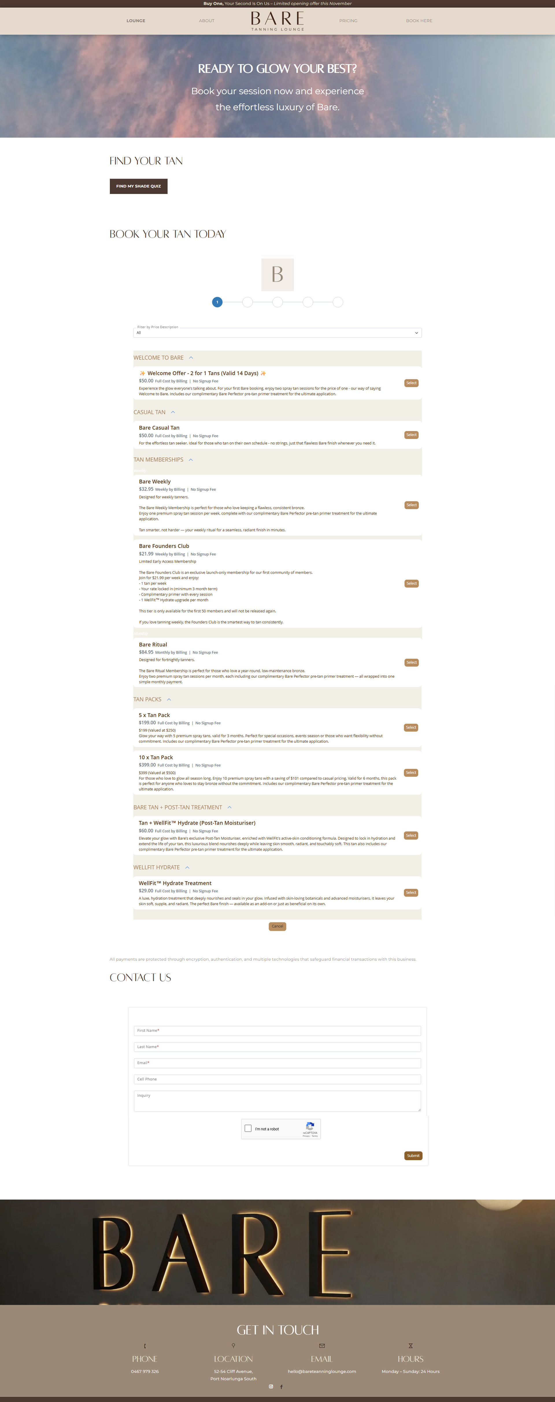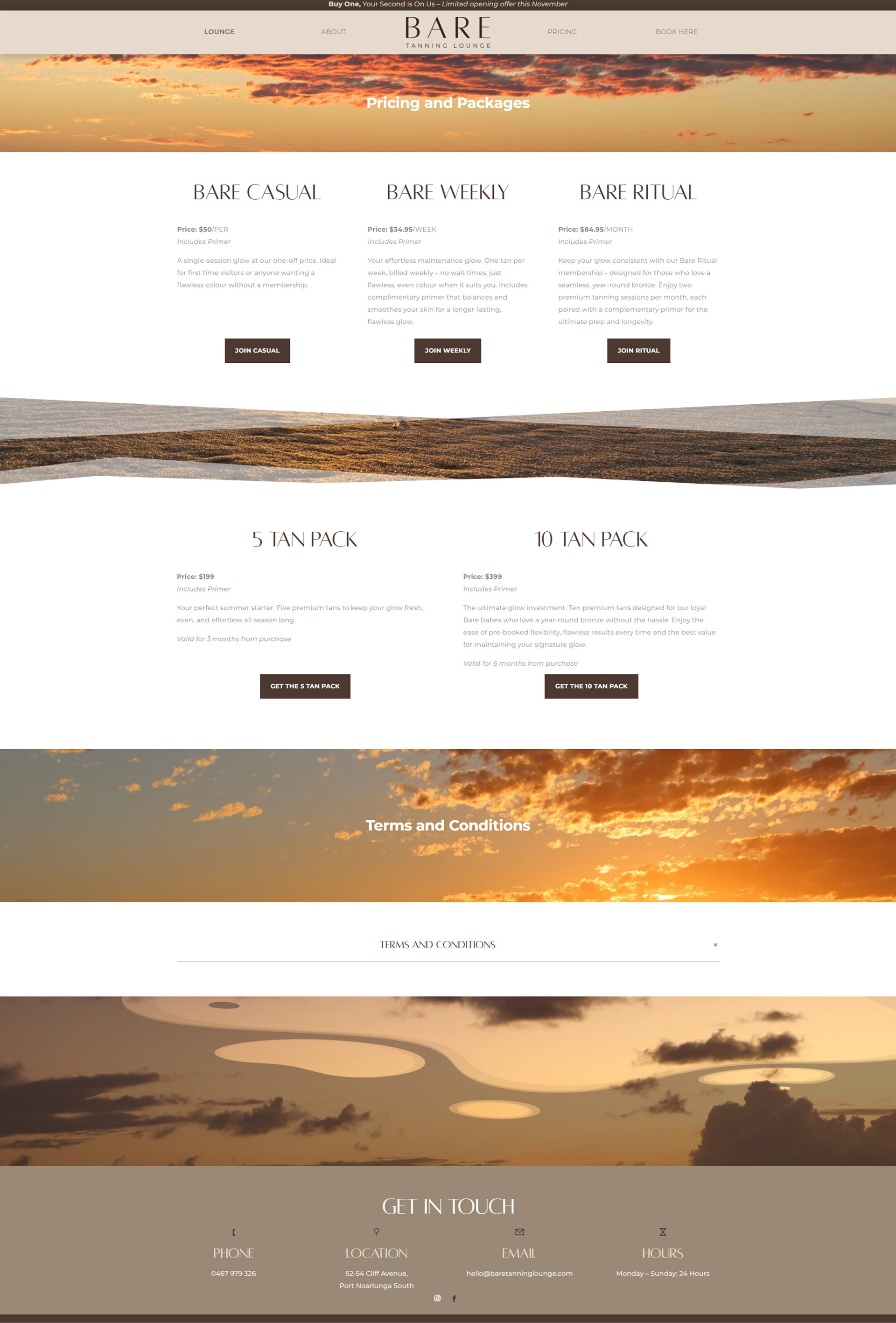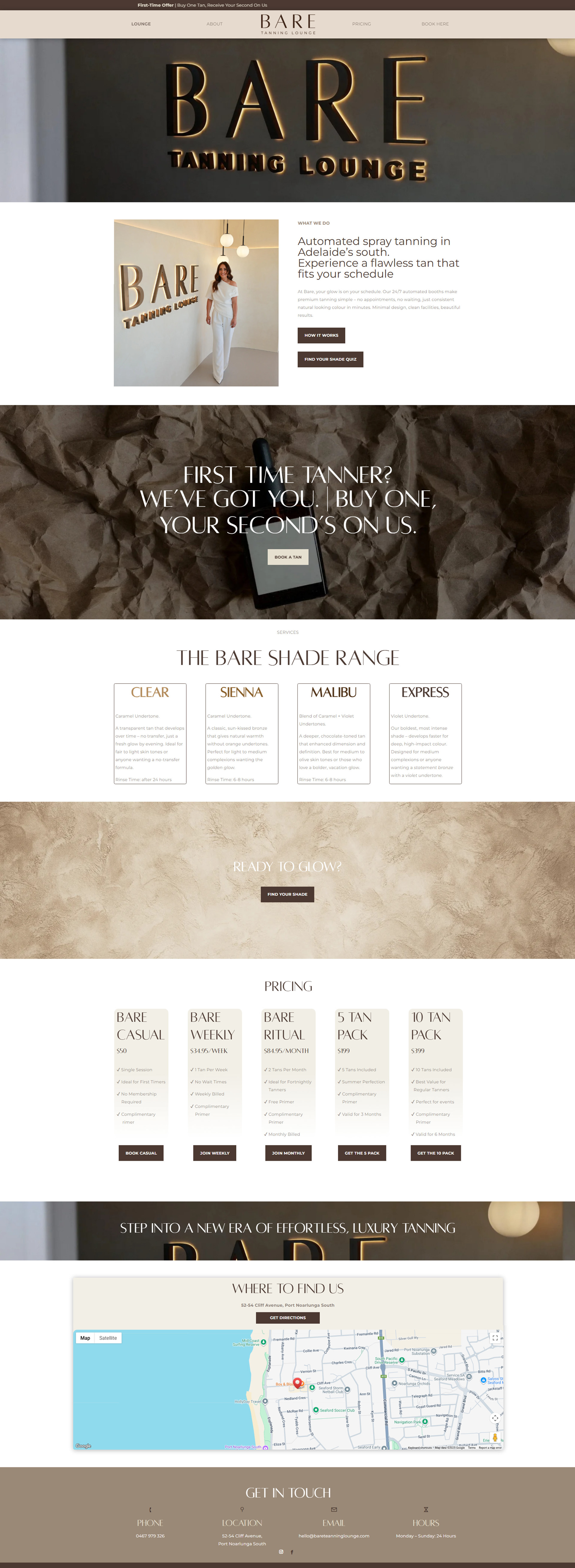 The website, accessible via https://baretanninglounge.com/ showcases the brand and the colour scheme throughout with a mix of creams and browns - showcasing the tanning colours and various skin-tones. Each webpage has a similar layout to keep the viewer understanding the User Interface quickly and making it accessible across multiple platforms with ease of transition.